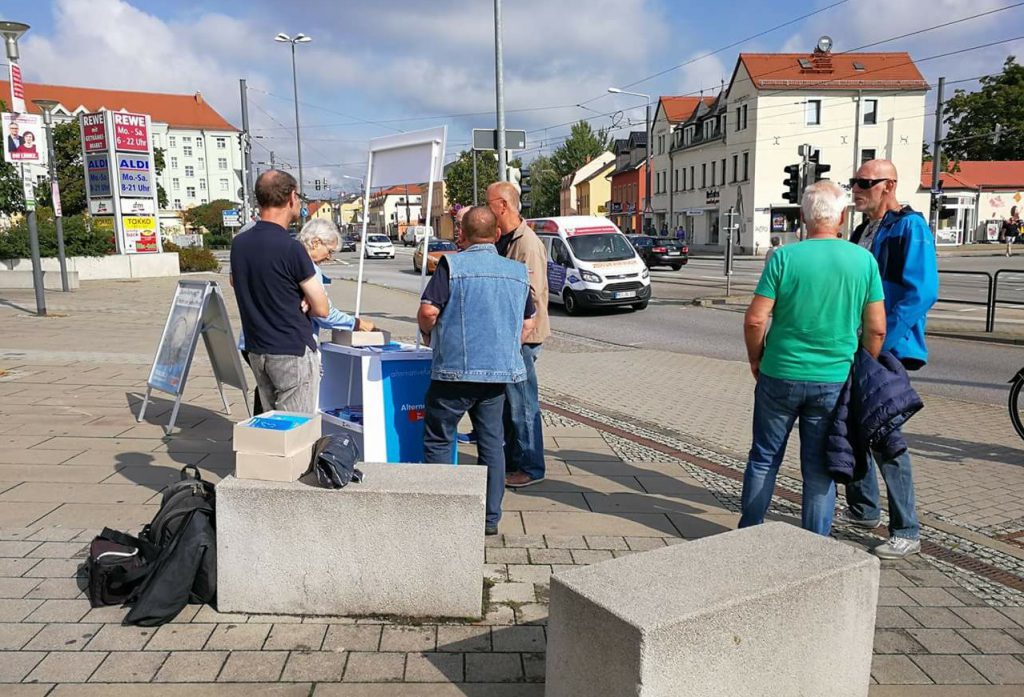 Die Ortsgruppe Nordwest hat am Sonnabend, dem 2. September 2017, ihren zweiten „heißen“ Wahlkampfstand im Wahlkreis DD II/BZ II absolviert. Zwischen 10 und 14 Uhr standen bei diesmal gutem Wetter der Ortsgruppenchef und Landesvize Thomas Hartung mit Kreisvorstand Arndt Noack, Kurt Kobelt sowie – natürlich – dem Ehepaar Ilona und Hans-Günther Hauptmann vor dem alten […]