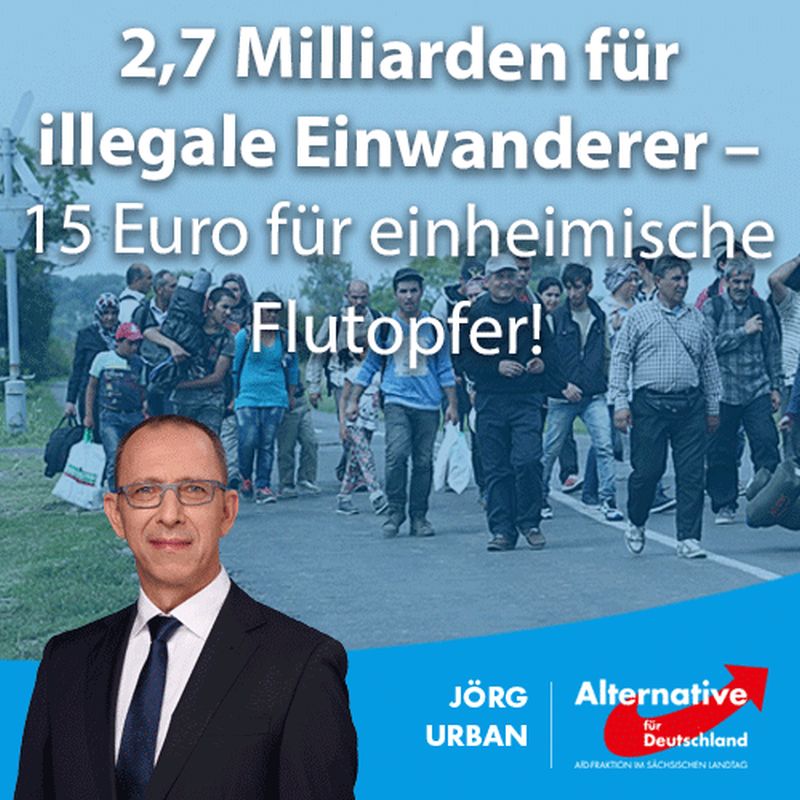 Erklärung der AfD-Fraktion Sachsen Sachsen hat in den vergangenen drei Jahren 2,7 Milliarden Euro für Asylbewerber ausgegeben, berichtet die „Bild“-Zeitung. Die Opfer der letzten Überflutung im Vogtland sollen dagegen mit 15 Euro pro Kopf abgespeist werden, meldet das Blatt. Jörg Urban, AfD-Fraktions- und Landesvorsitzender, erklärt: „Dieses krasse Missverhältnis zeigt einmal mehr, wo die sächsische […]