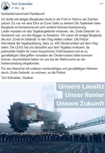 Am Freitag startete eine Kundgebung der Kumpel und Kraftwerksarbeiter am Kraftwerk „Schwarze Pumpe“ unterstützt vom Verein Pro Lausitzer Braunkohle e.V. gegen Gewalt und speziell gegen „Ende Gelände“.
