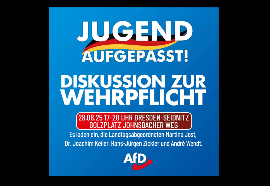 Am 02.09.25 fand eine Veranstaltung der Dresdner AfD-Bundestagsabgeordneten Thomas Ladzinski und Matthias Rentzsch statt.Als Gast war auch der Dresdner AfD-Kreisvorsitzende und Landtagsabgeordnete André Wendt anwesend. Nach kurzen Eröffnungsworten stellten die Teilnehmer zahlreiche Fragen – von den öffentlich-rechtlichen Medien bis hin zur Migrationspolitik. Die Kritik an der Politik der früheren – wie auch der aktuellen Regierung […]