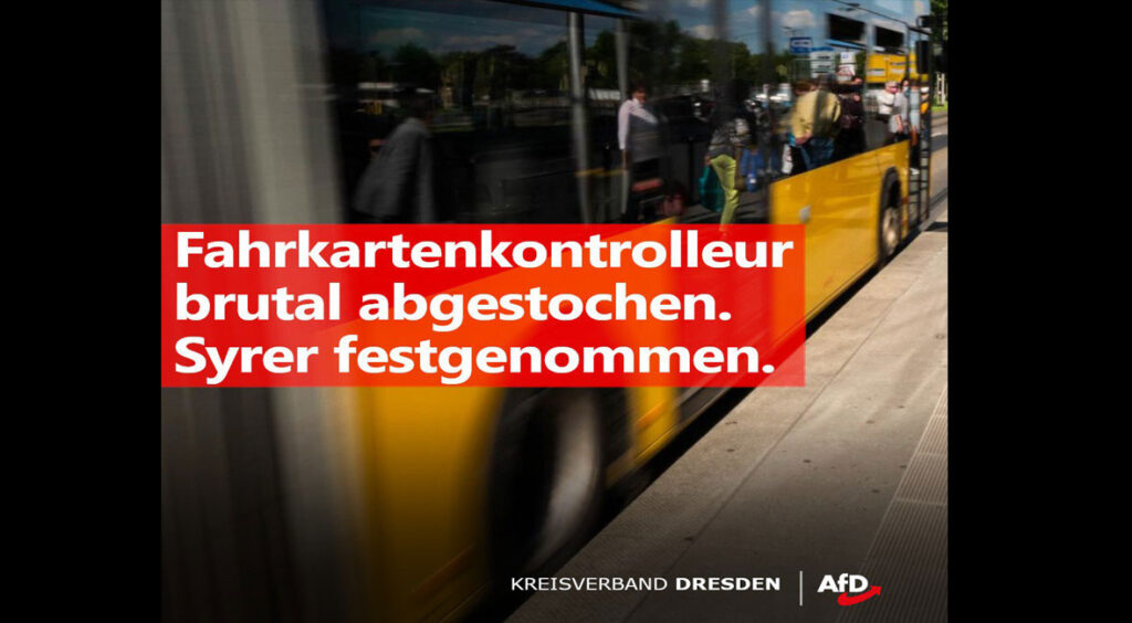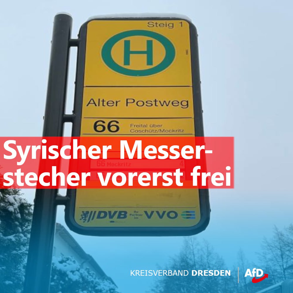 Zur Erinnerung: Am 30.10.2022 stach ein 23-jähriger Syrer in Dresden-Nickern einen Fahrkartenkontrolleur mehrmals in den Bauch und verletzte ihn schwer. Gestern verurteilte das LG Dresden den Täter zu zwei Jahren und acht Monaten Haft. Der Messerstecher ist sogar vorerst auf freien Fuß (wohnt in Dresden-Nickern). Ein solch mildes Urteil war leider zu erwarten. Wenn es