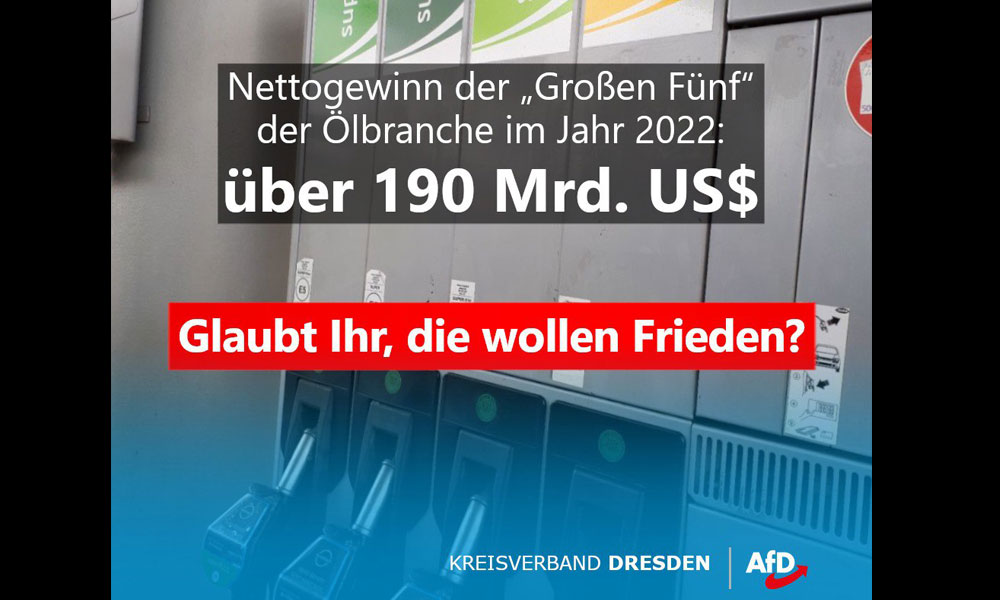 Exxon Mobil: 55,7 Mrd. $ (+140% Gewinnsteigerung zu 2021) – höchster Gewinn der Geschichte! Chevron: 35,5 Mrd. $ (+über 100% Gewinnsteigerung zu 2021) – höchster Gewinn der Geschichte! BP: 28 Mrd. $ (+über 100% Gewinnsteigerung zu 2021) – höchster Gewinn der Geschichte! Shell: 40 Mrd. $ (+über 100% Gewinnsteigerung zu 2021) – höchster Gewinn der