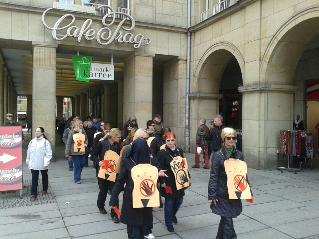 Ein Dutzend Dresdner AfD-Frauen hat heute Mittag im Stadtzentrum ein Zeichen gegen Sexismus gesetzt. Mit Schildern „Hände weg“ auf Deutsch, Englisch, Französisch und Arabisch spazierten sie im Vorfeld der Pegida-Kundgebung vom Wiener Platz über die Prager Straße und wieder zurück. Bis auf ein paar Wortgefechten mit linken Pegida-Gegendemonstranten am Bahnhof ernteten sie überwältigende Zustimmung. Flankiert von ihren Männern und ein paar Mitgliedern, verlief die Aktion störungsfrei.
