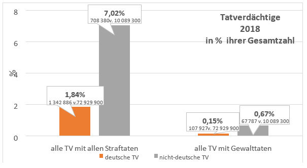 Die Zahlen sprechen für sich; ca. 3,8 mal häufiger wurden Straftaten 2018 von NichtDeutschen begangen, Gewaltdelikte sogar ca. 4,5 mal häufiger.