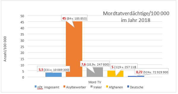 Damit liegt die Zahl der Mord-Tatverdächtigen unter den Nichtdeutschen (0,0033%) 4,6 fach über der der Deutschen (0,00072%). Fast jeden Tag des Jahres wird ein Mord/Mordversuch von Nicht-Deutschen irgendwo in Deutschland begangen! Drastisch über dem Durchschnitt der Deutschen liegt die Anzahl der mordtatverdächtigen Iraker (mit 0,0076% 10,6 fach!), gefolgt von Afghanen (0,005% 6,9 fach), s. Abb. 2*.