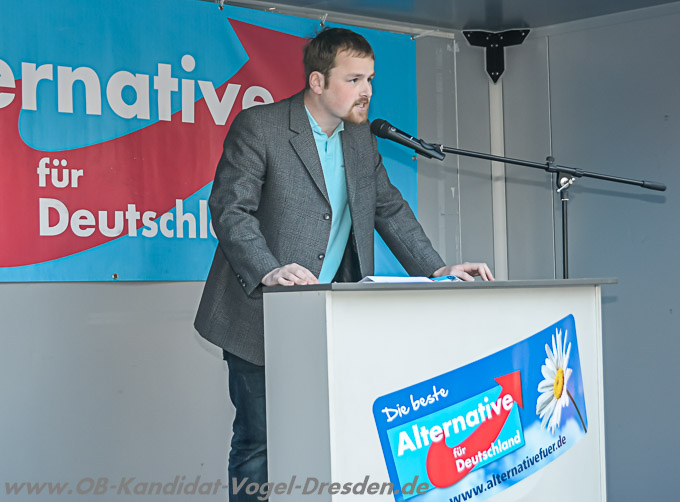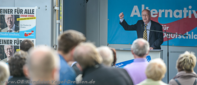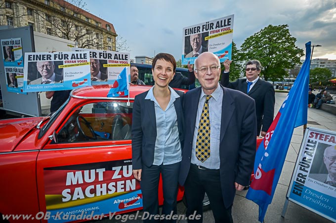 Am gestrigen Tag fand auf am Dr-Külz-Ring unser Wahlkampfauftakt zur diesjährigen OB-Wahl in Dresden statt. Die erfolgreiche Veranstaltung wurde von vielen Dresdnerinnen und Dresdner sowie Pressevertretern aus Funk, Zeitung und Fernsehen besucht. Kämpferisch stimmte unser Kandidat Stefan Vogel auf den Wahlkampf ein und wurde durch unsere Bundes- und Landesvorsitzende Dr. Frauke Petry,MdL unterstützt. Des Weiteren sprach auch das Mitglied des Landesvorstandes der Jungen Alternative, Matthias Scholz, zu den Anwesenden und machte deutlich, dass auch die Jugend auf den Kandidaten der AfD setzt. Stefan Vogel kritisierte in seiner Rede nicht nur die volksfremde Blockadepolitik der ROT-ROT-GRÜNEN Allianz im Dresdner Stadtrat, sondern auch die Herausforderer Stange, Ulbig und den „unabhängigen“ Kandidaten Hilbert.