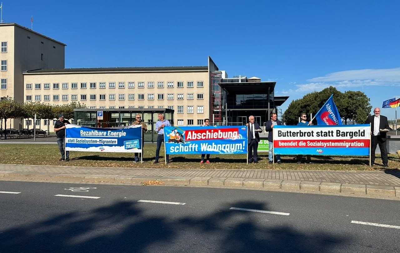 Zum Antrag unserer Landtagsfraktion „Butterbrot statt Bargeld! Sach- statt Geldleistungen in Sachsens Asyleinrichtungen“ organisierten wir eine Banneraktion vor dem Sächsischen Landtag, um auf die zerstörerische „Asylpolitik“ der Altparteien aufmerksam zu machen.